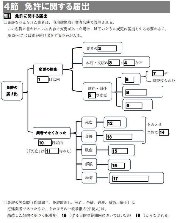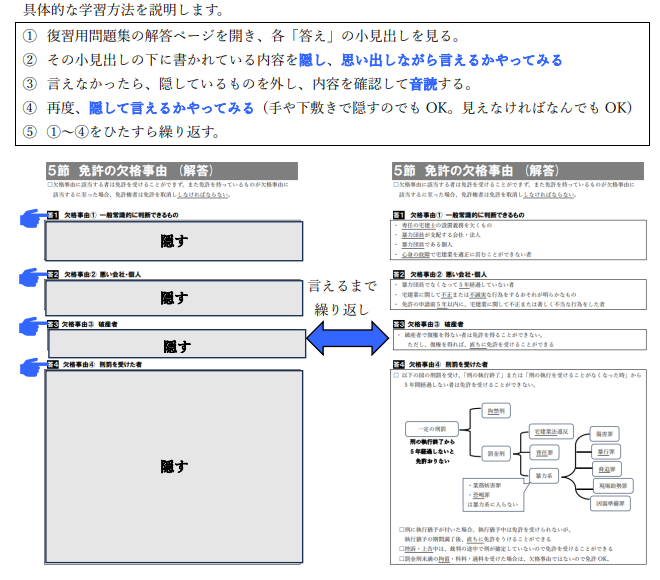 そこで、初学者でも無理なく学習が継続できるように「復習用問題集」を作成しました。用語の確認、覚えておくべき論点をサクサク確認できる穴埋めの問題集です。この復習用問題集で基本事項を身に着ければ、スムーズに過去問練習に移行できると思います。(下図の見本:宅建業法の問題集の一部)